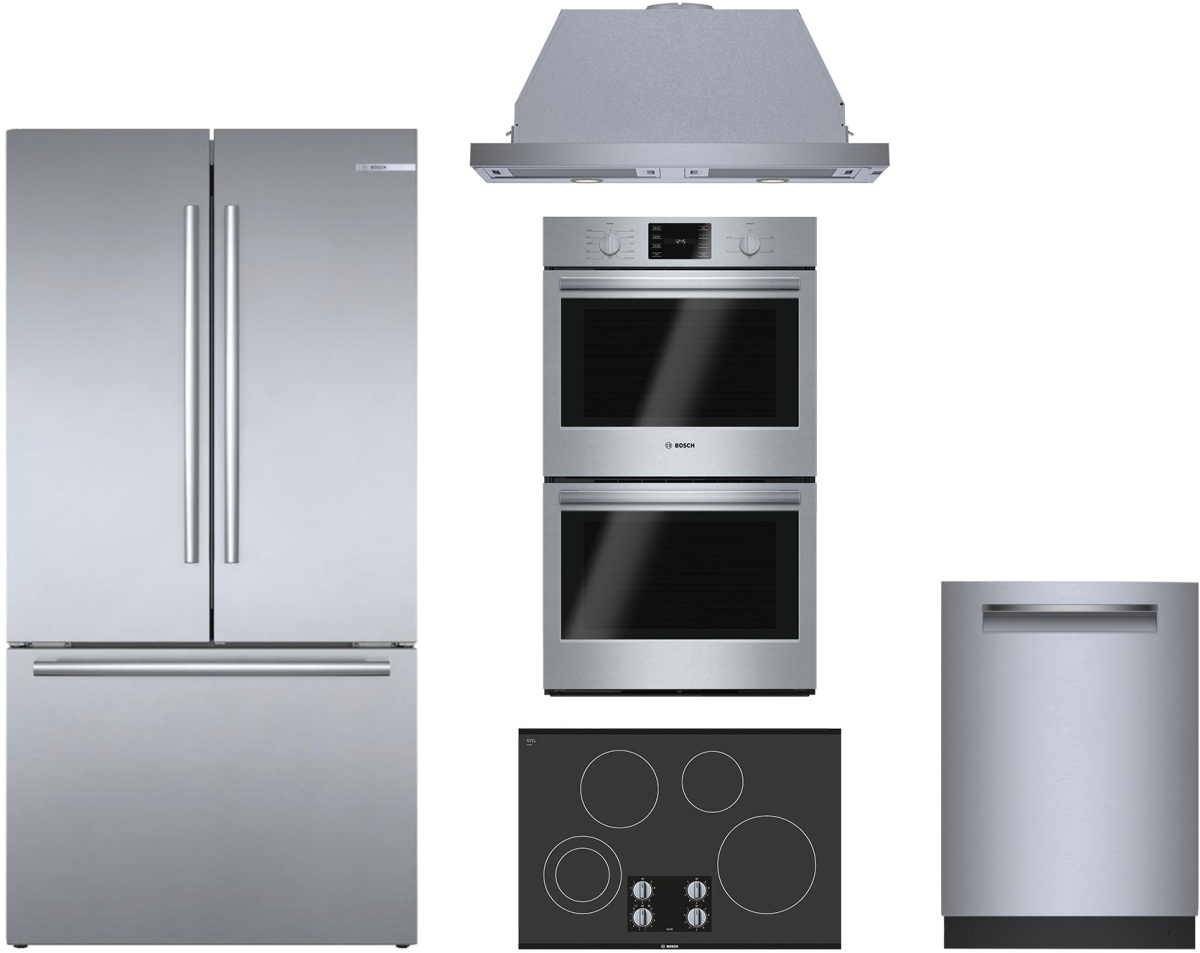 Bosch 5 Piece Stainless Steel Kitchen Package with French door refrigerator, built in dishwasher, double electric wall oven, electric cooktop and under cabinet range hood.Read More