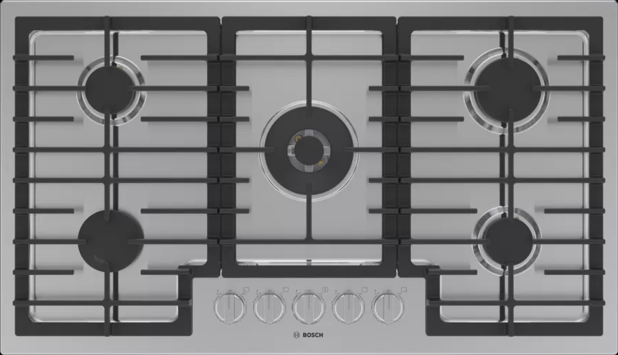 The Bosch 800® Series 36" Stainless Steel gas cooktop with control knob LED light line indicator and adjustable FlameSelect®. With a special enameling process, the heavy-duty continuous surface grates can be easily and quickly cleaned in the dishwasher.Read More