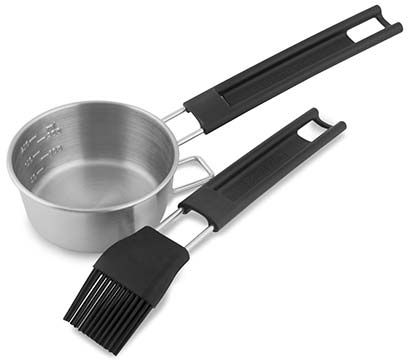 A modern redesign of a grilling classic. The silicone basting brush and stainless basting bowl can be used on the grill surface or side burner to apply warm sauce to anything cooking on the grill. Silicone is heat resistant to 500°F.