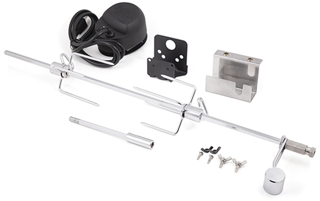 30.6-IN (77.72cm) pellet rotisserie kit includes a motor with on/off switch, heavy duty spit forks, counter balance, spit rod, and OEM brackets for Broil King® Pellet series grills.