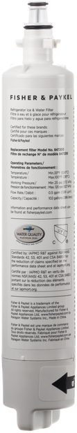 This water filter removes chemicals and contaminants from your drinking water, resulting in clean tasting and clean smelling water. We recommend a new filter every six months for optimal water drinkability and flow. Use with Fisher & Paykel Refrigerator Models beginning with: E442, RF610, RF522, E402, RF201, RF402, RF135, RF170, RS36, RF540, RS9120, RF605, RS90, RS36, RS6121, RS7621, RS4621, RS3084, RS2484, RS1884 If you have an older refrigerator model you may need to use part no. 8462285 or 8462288. Please check your filter for the part number before purchasing