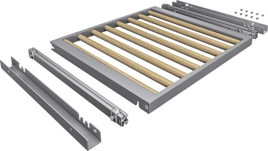 Fully extendable bottle trays with hidden telescopic rails in oak wood and solid aluminium in anthracite