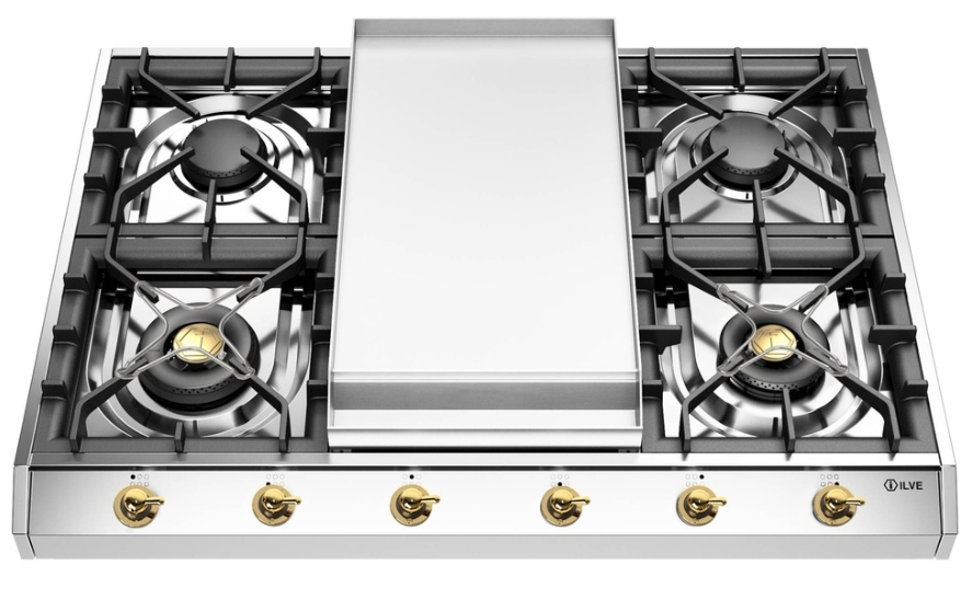 The Nostalgie II 36" built-in gas cooktop features 4 burners and griddle, designed for both style and functionality in stainless steel. It includes heavy cast iron pan grates for durability and stability while cooking. The cooktop is equipped with Total Black brass burners that feature a non-stick nanotechnological coating, ensuring easy maintenanceRead More
