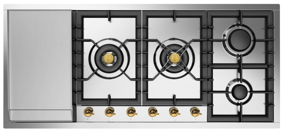 The Nostalgie II 48" built-in gas cooktop features 6 burners, designed for both style and functionality in stainless steel. It includes heavy cast iron pan grates for durability and stability while cooking. The cooktop is equipped with Total Black brass burners that feature a non-stick nanotechnological coating, ensuring easy maintenance and enhanced cooking performance.Read More