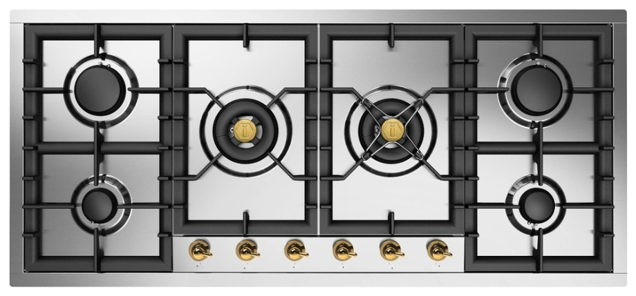The Nostalgie II 48" built-in gas cooktop features 6 burners, designed for both style and functionality in stainless steel. It includes heavy cast iron pan grates for durability and stability while cooking. The cooktop is equipped with Total Black brass burners that feature a non-stick nanotechnological coating, ensuring easy maintenance and enhanced cooking performance.Read More