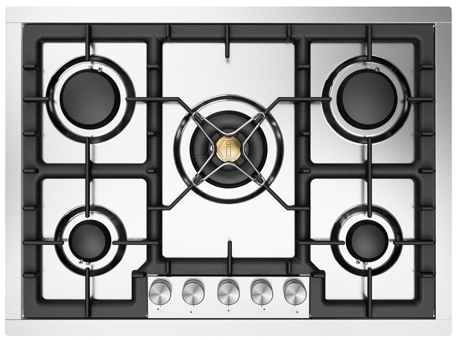 The 30" built-in gas cooktop features 5 burners, designed for both style and functionality in stainless steel. It includes heavy cast iron pan grates for durability and stability while cooking. The cooktop is equipped with Total Black brass burners that feature a non-stick nanotechnological coating, ensuring easy maintenance and enhanced cooking performance.Read More